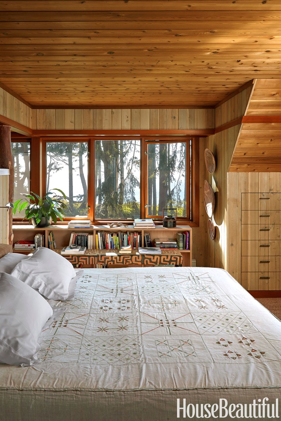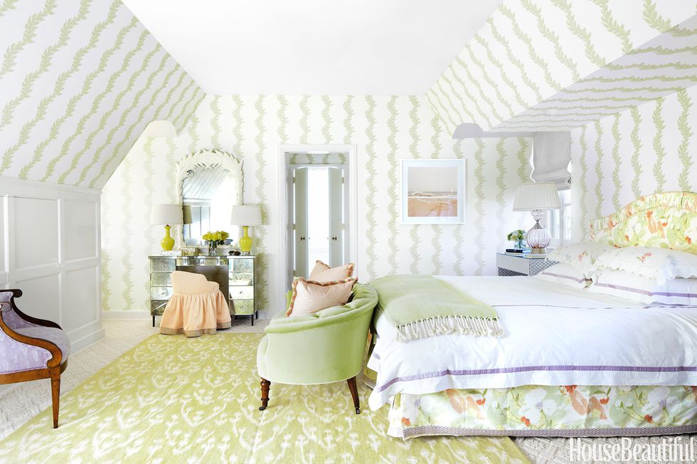 In a Lake Forest, Illinois, house full of strong rooms, the master bedroom's pale colors offer a serene respite. designer Ruthie Sommers began with the patterned rug from Melrose Carpet and the striped Acanthus wallpaper by Farrow & Ball. The matching headboard and bed skirt are in Madeleine by Carleton V with Samarkand trim by Old World Weavers.