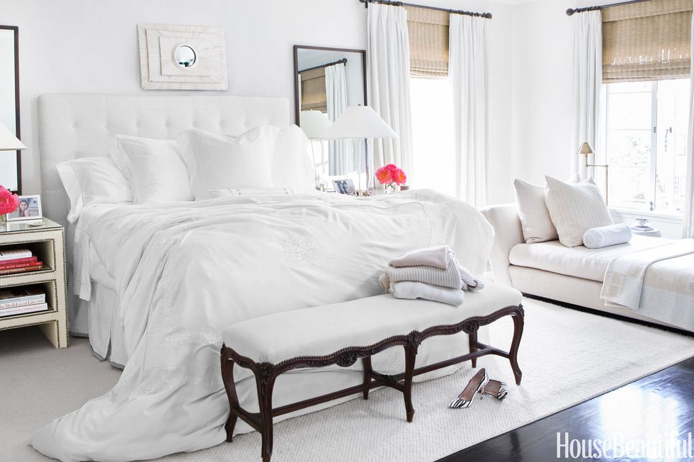 "I like the serenity of pure white linens and very soft, muted colors," designer Brooke Davenport says of the master bedroom in her Los Angeles house. The custom headboard is upholstered in a Scalamandré linen, and the Minotti chaise longue is covered in a Donghia fabric. Custom nightstands and mirrors. Lamps, Ralph Lauren Home. Cocoon silk duvet over Sferra bed linens. Bone mirror above bed, JF Chen.