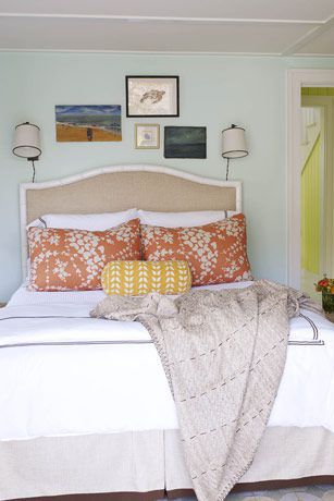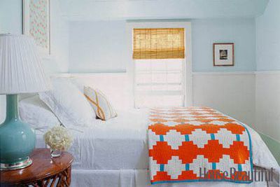 To add punch to the master bedroom of an Old Greenwich, Connecticut, house, designer Lee Ann Thornton upholstered a bench in an orange linen, Tuska/19 from Malabar. The John Robshaw print on the throw pillows reinforces the orange theme. The bed is upholstered in Stella Sand from Lulu DK. Lantern and nightstands from Mecox Gardens.