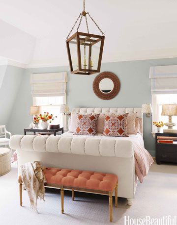 This large guest room in a Charlotte, North Carolina, house, needed graphic punch. Designer Lindsay Coral Harper started with the Stark carpet, and ended with the Greek Key pendant light from C. Bell. Walls are painted Benjamin Moore's Van Deusen Blue. Vintage nightstands are from Liza Sherman; Julia B. bedding.