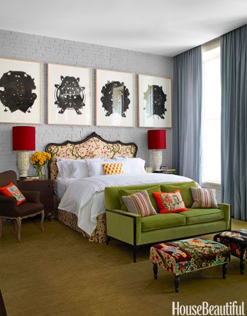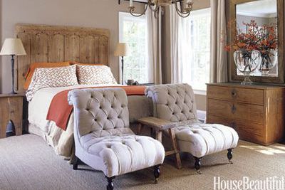 In the master bedroom of a comfortable family house, an antique door is the headboard, a trick designer Kay Douglass often uses to add interest while taking up less space in the room. Ivy-patterned pillowcases are custom-made from Galbraith & Paul fabric. The pair of Earl chairs are from South of Market. Walls are Seapearl by Benjamin Moore.