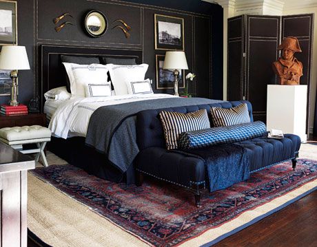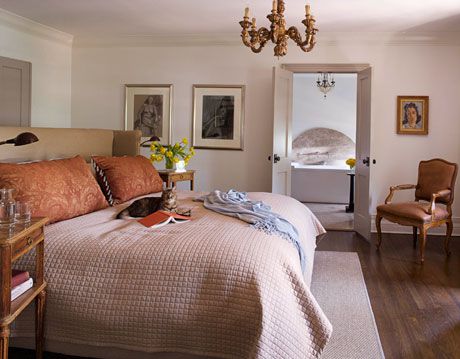 Designer Mary McDonald covered one wall in the bedroom of a Los Angeles home in Ralph Lauren gray suiting wool to make it feel cozy, but painted the other walls Alabaster by Sherwin-Williams to keep it light. Bed linens are from Williams-Sonoma. Pillows are of vintage silk necktie fabrics from F&S Fabrics.