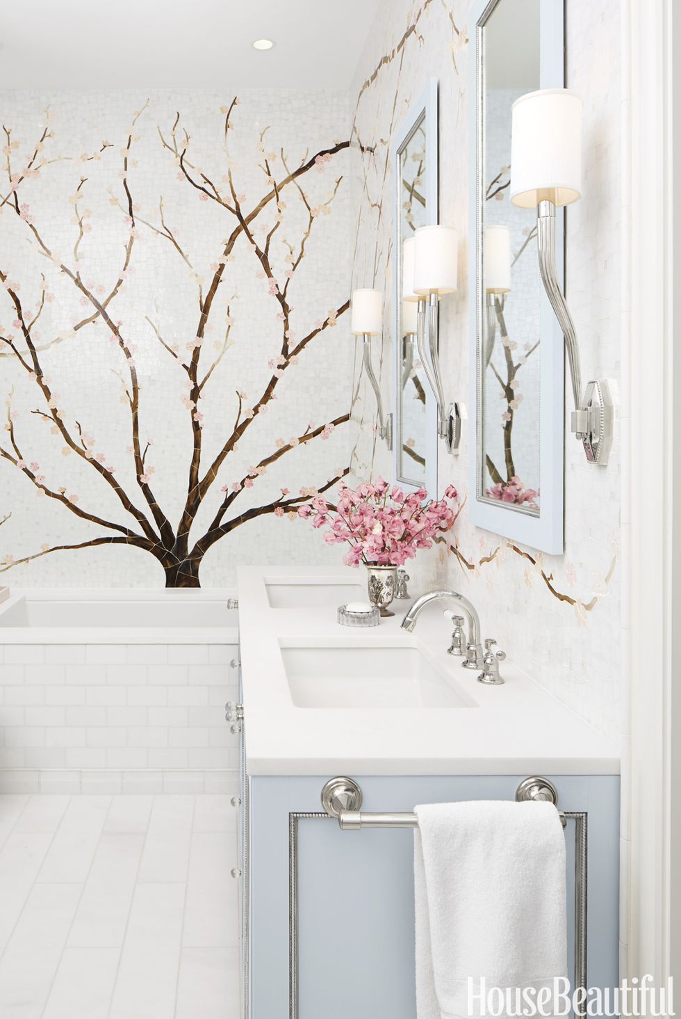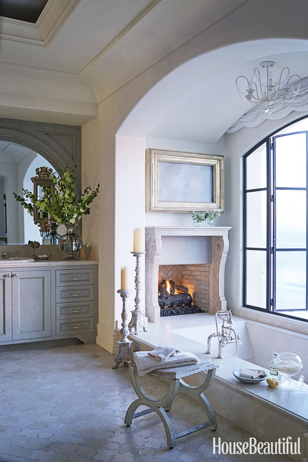 The arched window and the view from this California bathroom were so magnificent designer Ohara Davies-Gaetano didn't want to put a big white porcelain tub in front of it. Instead, she designed a sunken bath made from slabs of Crema Marfil marble. "Imagine lying in the bath with the flames flickering and the sun setting over the Pacific," she says. "What could be more relaxing?"