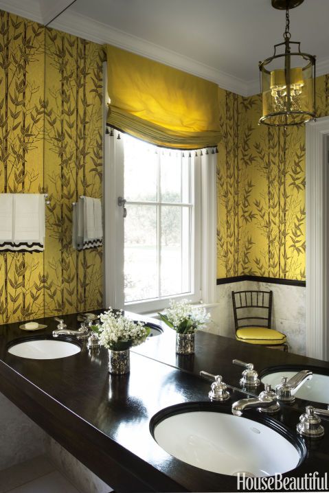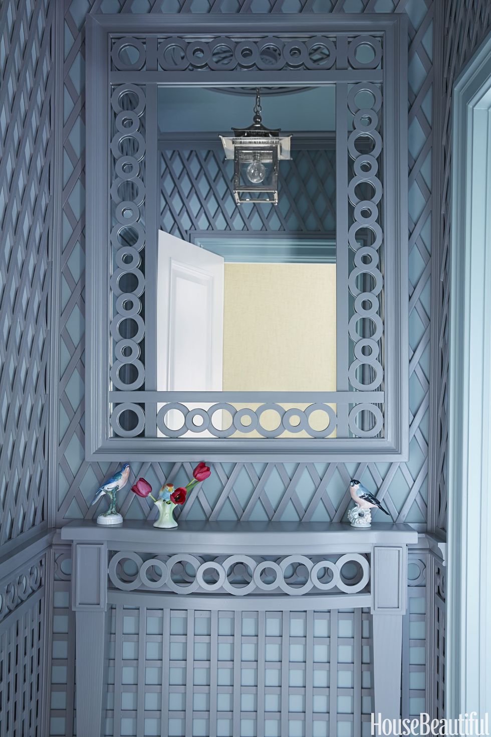 Chinoiserie meets orangery in the trellis-accented powder room, with millwork by Philippe Le Manach of Accents of France. The walls are painted in Dix Blue and treillage in Plummett, both by Farrow & Ball. The lantern above is from Charles Edwards.