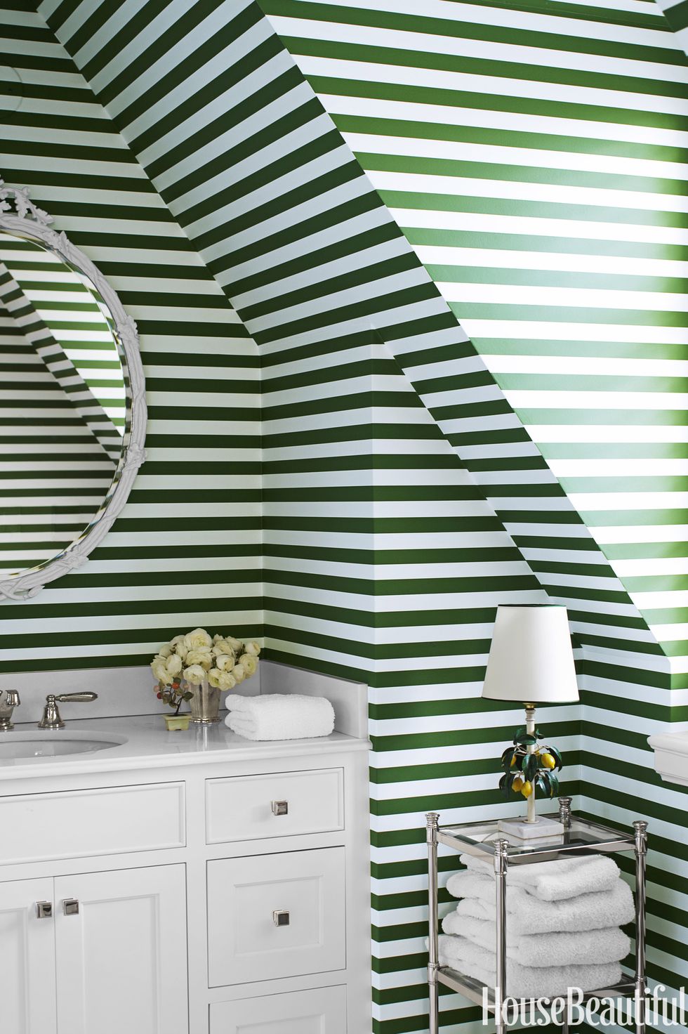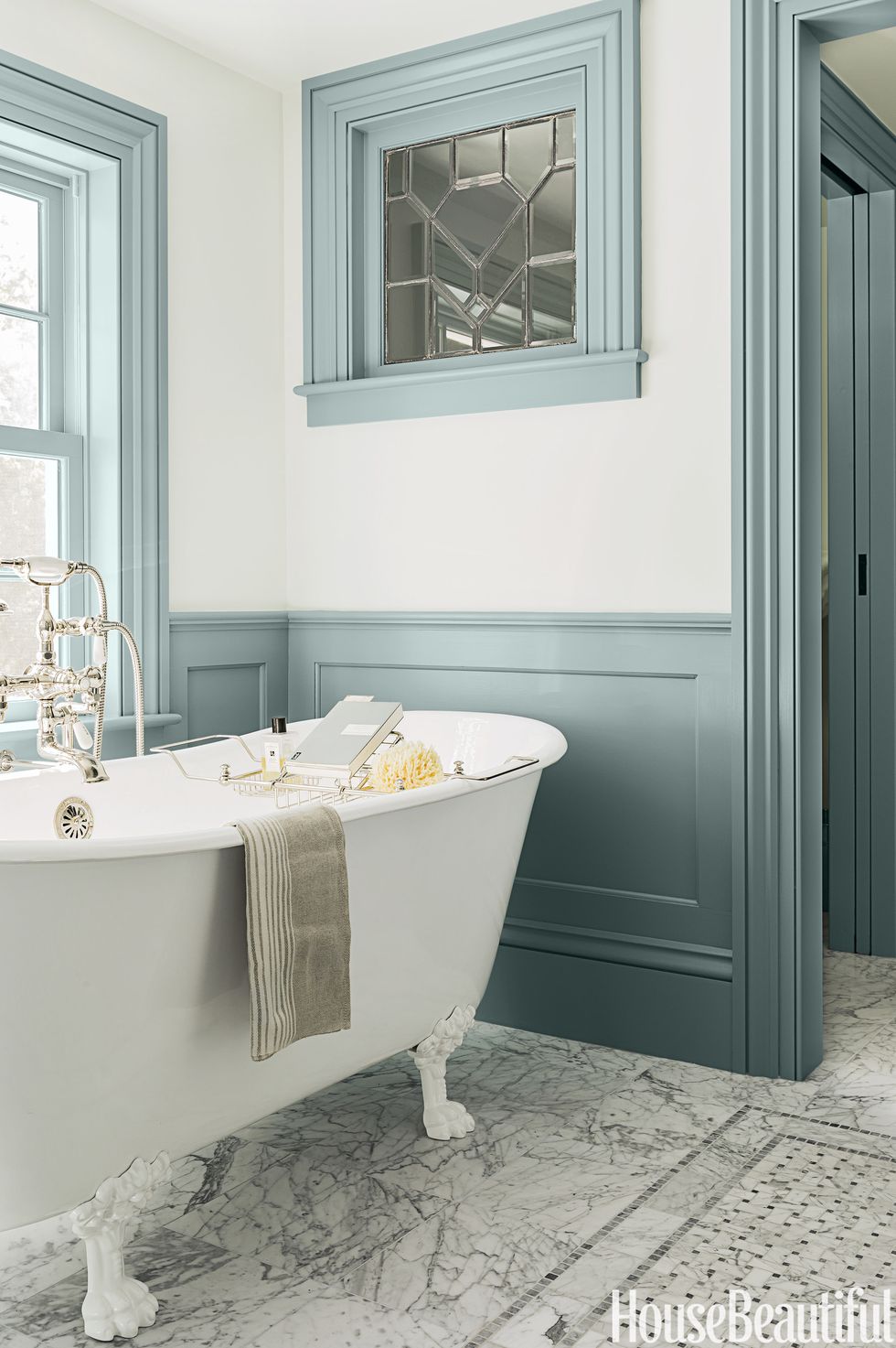 Back in the 18th-century when this Massachusetts farmhouse was built, there was no such thing as a master bath. So architect Michael T. Gray and interior designer Hattie Holland, both of Carpenter & MacNeille, carved one out of a hallway and added wainscoting and window casings to create a sense of the past. Painted a deep blue-gray, they stand out against the pale blue walls. The color "has a historic feeling with that gray cast and plays off the Carrara marble so well," Holland says. In the center of the floor, a virtual rug made of marble in a basket-weave pattern adds another layer of detail to the room.