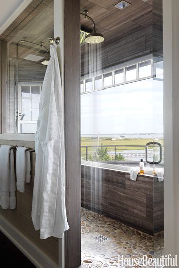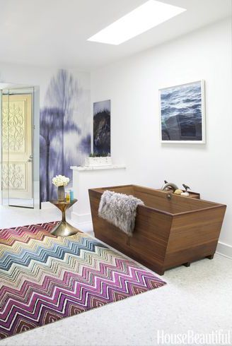 A Missoni rug makes a colorful fashion statement in the master bath of a Malibu house designed by Todd Nickey and Amy Kehoe. As an homage to the wife's love of horses, Nickey had a redwood ofuro soaking tub by Sea Otter made in the style of an old wooden trough. The "blurry trees" imagery of Trove's Nyx wall-paper brings in another outdoorsy touch.