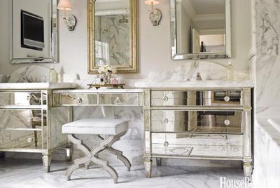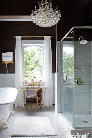 In an antique-filled Victorian house in Illinois, designer Annie Brahler chose the master bath's chocolaty walls to play up the brilliant whites of a recycled tub, curtains in Kally Almost White sheer from Hancock Fabrics, and Daltile floor and shower tiles. The crystal light fixture is a 1980s update of old-school glamour.
