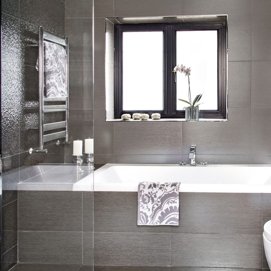 Go for gleaming metallic tones and shimmering greys for a bathroom with glamour. Choose a single tile colour and look for designs in two contrasting textures or finishes. Here, a grey textured design at the head and foot of the bath adds sparkle to the room, while the larger format version elsewhere provides a streamlined low-sheen, matt-finish contrast.